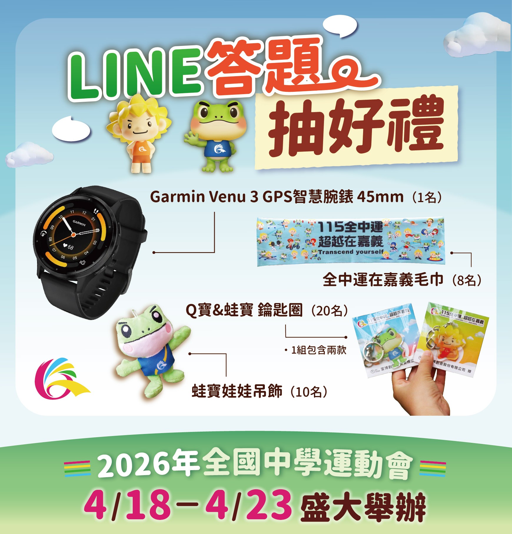 獎項內容 Garmin Venu 3 GPS 智慧腕錶 45mm(1名)、蛙寶娃娃吊飾(10名)、Q寶&蛙寶鑰匙圈(20名)、全中運在嘉義毛巾(8名)