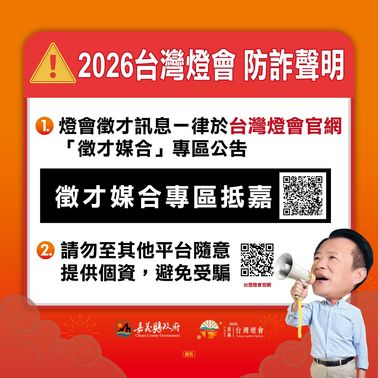 縣府指出,「2026台灣燈會」所有正式徵才資訊,僅會透過「2026台灣燈會官方網站」 https://2026taiwanlanternfestival.org/ 統一公告,不會透過私人社群帳號、不明連結或非官方表單進行徵才。