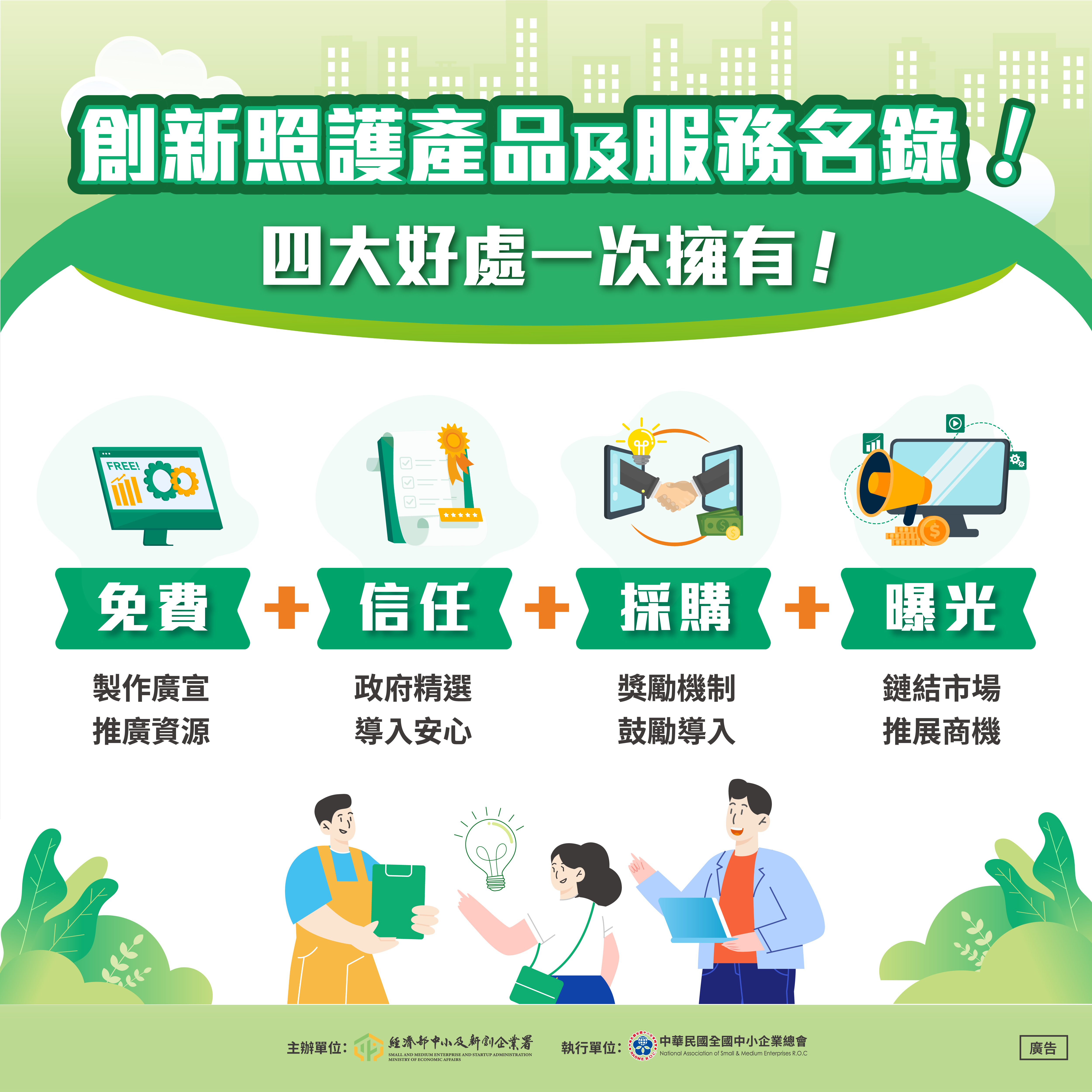 經濟部中小及創新企業署為強化以普惠科技打造樂活銀髮世代,推動智慧醫療科技實際應用於高齡照護,新創解方對接照護機構,以因應我國即將邁入高齡化社會所帶來的衝擊,期望透過創新科技優勢,落實應用至高齡化社會,同時促進我國新創科技產業發展,故辦理「創新照護產品及服務名錄」公開徵求,提供高齡照護機構選購多元、普惠之高齡科技新創解方,串聯照護機構資源進行科技島入與布建,提高我國新創市場商機及能見度。